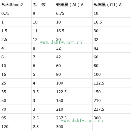 “二點五下乘以九,往上減一順號走”說的是2.5mm’及以下的各種截面鋁芯絕緣線,其載流量約為截面數(shù)的9倍。如2.5mm’導(dǎo)線,載流量為2.5×9=22.5(A)。從4mm’及以上導(dǎo)線的載流量和截面數(shù)的倍數(shù)關(guān)系是順著線號往上排,倍數(shù)逐次減l,即4×8、6×7、10×6、16×5、25×4。