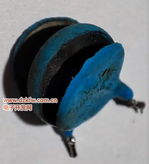 壓敏電阻與電容非常相似,它的上面一般標(biāo)有14D681K或14D681。14D表示直徑為14mm, 681表示擊穿電壓為680V,壓敏電阻一般損壞的表現(xiàn)為漏電,擊穿,和炸裂等故障。