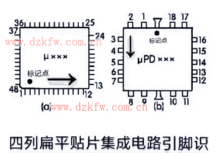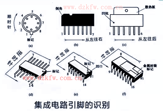 在電路板上對于圓形封裝的集成電路,在它的金屬凸起位置開始,沿順時針方向依次為1~2~3~……如上圖(a)所示。單列直插式見圖(b)所示,它有一個側角,側角下就是1腳,從左往右依次數腳即可。雙列直插式,它有一個凹點為記號,凹點對應下的腳為1,依次往后數數即可。對于貼片式的集成塊,它只是體積小一些,都有標記開始點,從標記點依次往后面排隊數即可。