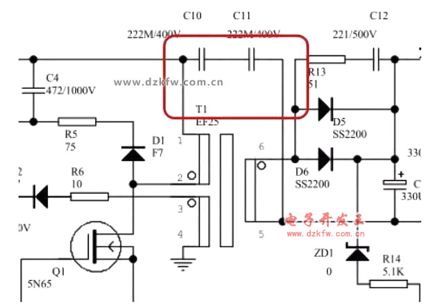 Y電容用來消除共模干擾。分別跨接在電力線兩線和地之間(L-E,N-E)的電容,一般是成對出現,濾除高次諧波,防止干擾,提高輸出電壓質量。基于漏電流的限制,Y電容值不能太大,Y電容通常采用高壓瓷片的。