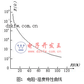 鉻酸鎂-二氧化鈦陶瓷濕敏元件是較常用的一種濕度傳感器,它是由MgCr2O4-TiO2固熔體組成的多孔性半導體陶瓷。這種材料的表面電阻值能在很寬的范圍內隨濕度的增加而變小,即使在高濕條件下,對其進行多次反復的熱清洗,性能仍不改變。該元件采用了MgCr2O4-TiO2多孔陶瓷,電極材料二氧化釕通過絲網印制到陶瓷片的兩面,在高溫燒結下形成多孔性電極。在陶瓷片周圍裝置有電阻絲繞制的加熱器,以450°C、1min對陶瓷表面進行熱清洗。濕敏電阻的電阻-相對濕度特性曲線如圖1所示。