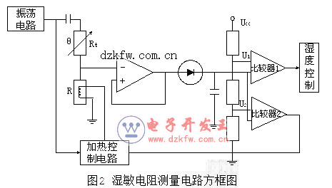 圖2是這種濕敏元件應用的一種測量電路。圖中R為濕敏電阻,Rt為溫度補償用熱敏電阻。為了使檢測濕度的靈敏度最大,可使R=Rt。這時傳感器的輸出電壓通過跟隨器并經整流和濾波后,一方面送入比較器1與參考電壓U1比較,其輸出信號控制某一濕度;另一方面送到比較器2與參考電壓U2比較,其輸出信號控制加熱電路,以便按一定時間加熱清洗。