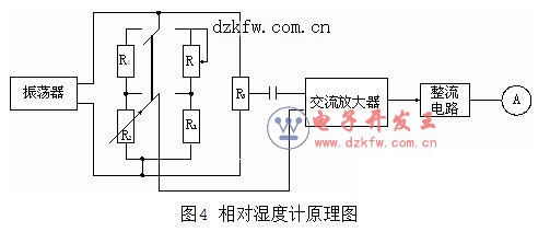 圖4是一種相對濕度計的電原理框圖。測量探頭由氯化鋰濕敏電阻R1和熱敏電阻R2組成,并通過三線電纜接至電橋上。熱敏電阻是作為溫度補償用,測量時先對指示裝置的溫度補償進行適當修正,將電橋校正至零點,就可以從刻度盤上直接讀出相對濕度值。電橋由分壓電阻R5組成兩個臂,另外,R1和R3或R2和R4組成另外兩個臂。電橋由振蕩器供給交流電壓。電橋的輸出經放大器放大后,通過整流電路送給電流表指示。