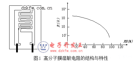 圖3是氯化鋰濕敏電阻的結構圖。它是在聚碳酸酯基片上制成一對梳狀金電極,然后浸涂溶于聚乙烯醇的氯化鋰膠狀溶液,其表面再涂上一層多孔性保護膜而成。氯化鋰是潮解性鹽,這種電解質溶液形成的薄膜能隨著空氣中水蒸汽的變化而吸濕或脫濕。感濕膜的電阻隨空氣相對濕度變化而變化,當空氣中濕度增加時,感濕膜中鹽的濃度降低。