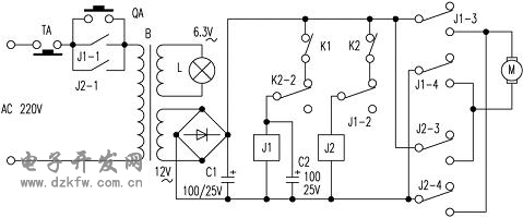 電源變壓器B、橋式整流堆和電容C1組成12V直流電源。繼電器J1、J2和行程開關(guān)K1、K2組成互鎖電源極性切換電路。