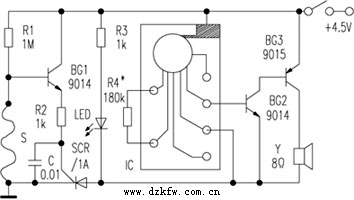 如遇盜情,S被斷開,BG1立即得電工作。BG1射極電流經R2觸發SCR導通,指示燈LED亮,IC輸出報警信號,經BG2、BG3復合放大后,驅動揚聲器放音。這時即使是把S重新接通,也照報不誤,只有關閉電源開關才能解除報警,所以具有防破壞作用。