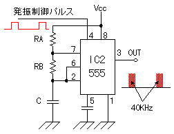 IC2組成超聲波載波信號發生器。由IC1輸出的脈沖信號控制,輸出1ms頻率40kHz,占空比50%的脈沖,停止64ms。計算公式如下: