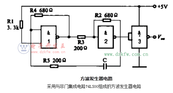 采用與非門集成電路74LS00組成的方波發生器電路。所示是一種采用與非門集成電路74LSOO組成的方波發生器電路。其中與非門1、2與外界RC時間常數元件組成振蕩電路,與非門3為緩沖輸出級。只要改變C的容量,便可獲得不同頻率的方波輸出。
