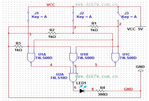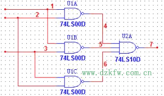 根據上述說明,結合前面的邏輯電路,可得到三人表決器的原理圖(仿真圖)為: