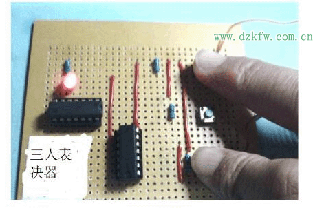 按安裝電路圖完成電路的組裝后,通上+5v電源,按下輸入端A、B、C的按鈕進行不同的組合,觀察發光二極管的亮滅,驗證電路的邏輯功能。如果輸出結果與輸入中的多數一致,則表明電路功能正確,即多數人同意(電路中用“1”表示),表決結果為同意;多數人不同意(電路中用“0”表示),表決結果為不同意。