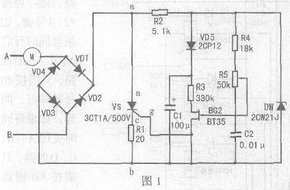 R2為限流電阻,它應保證穩定DW1 在穩壓范圍,穩定電流在10~20mA 左右,它并保證了脈沖移相角,當R2增大,移相角減小,電機兩端的電壓調節范圍減少。
