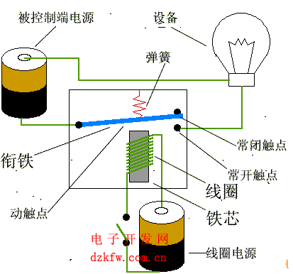 電磁式繼電器一般由鐵芯、線圈、銜鐵、觸點簧片等組成的。只要在線圈兩端加上一定的電壓,線圈中就會流過一定的電流,從而產生電磁效應,銜鐵就會在電磁力吸引的作用下克服返回彈簧的拉力吸向鐵芯,從而帶動銜鐵的動觸點與靜觸點(常開觸點)吸合。當線圈斷電后,電磁的吸力也隨之消失,銜鐵就會在彈簧的反作用力返回原來的位置,使動觸點與原來的靜觸點(常閉觸點)吸合。這樣吸合、釋放,從而達到了在電路中的導通、切斷的目的。對于繼電器的「常開、常閉」觸點,可以這樣來區分:繼電器線圈未通電時處于斷開狀態的靜觸點,稱為「常開觸點」;處于接通狀態的靜觸點稱為「常閉觸點」。