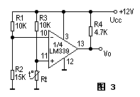 圖3為某儀器中過熱檢測保護電路。它用單電源供電,1/4LM339的反相輸入端加一個固定的參考電壓,它的值取決于R1于R2。UR=R2/(R1+R2)*UCC。同相端的電壓就等于熱敏元件Rt的電壓降。當機內溫度為設定值以下時,“+”端電壓大于“-”端電壓,Uo為高電位。當溫度上升為設定值以上時,“-”端電壓大于“+”端,比較器反轉,Uo輸出為零電位,使保護電路動作,調節R1的值可以改變門限電壓,既設定溫度值的大小。