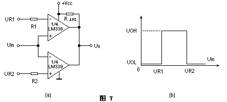 圖7電路由兩個LM339組成一個窗口比較器。當被比較的信號電壓Uin位于門限電壓之間時(UR1<Uin<UR2),輸出為高電位(UO=UOH)。當Uin不在門限電位范圍之間時,(Uin>UR2或Uin<UR1)輸出為低電位(UO=UOL),窗口電壓ΔU=UR2-UR1。它可用來判斷輸入信號電位是否位于指定門限電位之間。