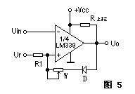 如果需要將一個跳變點固定在某一個參考電壓值上,可在正反饋電路中接入一個非線性元件,如晶體二極管,利用二極管的單向導電性,便可實現上述要求。圖5為其原理圖。
