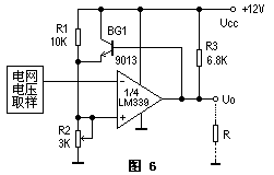 圖6為某電磁爐電路中電網過電壓檢測電路部分。電網電壓正常時,1/4LM339的U4<2.8V,U5=2.8V,輸出開路,過電壓保護電路不工作,作為正反饋的射極跟隨器BG1是導通的。當電網電壓大于242V時,U4>2.8V,比較器翻轉,輸出為0V,BG1截止,U5的電壓就完全決定于R1與R2的分壓值,為2.7V,促使U4更大于U5,這就使翻轉后的狀態極為穩定,避免了過壓點附近由于電網電壓很小的波動而引起的不穩定的現象。由于制造了一定的回差(遲滯),在過電壓保護后,電網電壓要降到242-5=237V時,U4<U3,電磁爐才又開始工作。這正是我們所期望的。