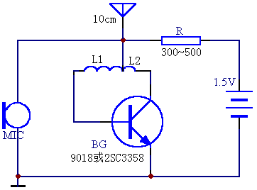 BG與L及三極管結電容組成高頻振蕩電路三極管的結電容約有2~3P,要使頻率落在FM范圍內,線圈應在直徑5mm芯一繞7圈,電容話筒受話時的振動調制著高頻信號產生頻偏,實現調頻。其發射距離與發射管工作電流大小有關,電阻不能先得太大也不能太小,在300~500歐之間,功率不足1毫瓦。
