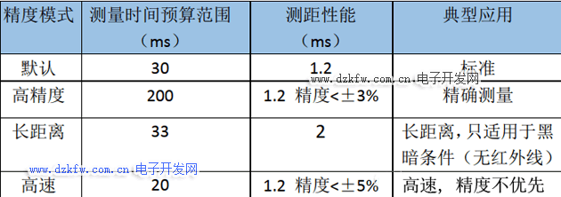 而在長(zhǎng)距離精度模式下,測(cè)距距離能達(dá)到 2m,測(cè)量時(shí)間在 33ms 內(nèi),
