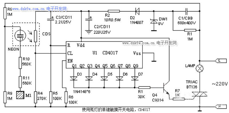 觸摸式照明開關是一種非常實用的電子開關,用手觸摸一下導電片,就能實現開關動作 ,使用方便可靠、電路簡單、性能穩定、壽命長、節電效果明顯。適合于愛好者自制。電路原理如圖1所示。接通電源后,因C3、R5的微分作用,CD4017自動復位清零,插座為斷電狀態。當人手觸摸M1后,氖燈發光,CDS的阻值減小使U1的CL端變為高電平,Q1由此輸出高電平,使TRIAC導通點亮燈泡。當人手再一次觸摸M1后,U17計數一次,Q1變為低電平,Q2輸出高電平,依次類推,從而實現觸摸開關功能。市電兩輸入線分別通過R8、R9接至觸摸電路,因此安裝時無需區分相線、零線。CDS的亮阻為20K,暗阻大于2MΩ。