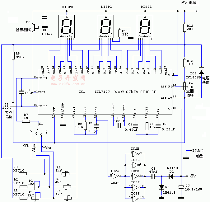 這個ICL7107 構成的多點溫度電路用于電腦內部溫度顯示裝置,亦可運用其它場合測溫?梢燥@示的數字溫度計電路圖。