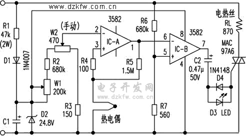 市電AC220V經R1降壓、D1半波整流、D2削波穩壓、C1濾波后作為比較器件IC的電源電壓及調溫設定電壓源。IC-A③腳為熱電偶檢測電壓輸入端(與溫度值對應);②腳為調溫設定電壓。在②、③腳兩端電壓比較后,由①腳輸出。其中R5的作用是將輸入的很少一部分反饋至同相輸入端③腳,以使在小信號波動時輸出鎖定不變。當熱電偶檢到溫度偏低時;③腳電平相對②腳低,使輸出①腳也低。進而使IC-B放大器⑥腳相對于固定偏置的⑤腳偏低,使輸出⑦腳為高。由于IC-B⑤腳電壓是由AC220V經R6、R7分壓而得,因而,頻率、相位完全與AC220V相同。與⑥腳直流比較后在⑦腳輸出交流電壓。該交流電壓經C2、D4、D3和D4反向并聯(作用同雙向二極管)觸發雙向可控硅,使相應的電壓加到烙鐵電熱絲上,以達到恒溫的目的。