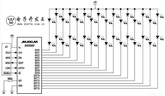 MAX6969采用工業標準的移位寄存器加鎖存器形式的串行接口。數據通過數據輸入DIN和時鐘輸入CLK移入16位移位寄存器。16個時鐘周期后,輸入數據出現在輸出端DOUT上,這樣,可允許多個MAX6969級聯。鎖存使能輸入LE將移位寄存器的16位數據裝入16位輸出鎖存器,以設定各個LED的開關狀態。輸出使能/OE控制所有16路輸出的開關狀態,其快速響應特性適合作為控制LED亮度的PWM輸入。