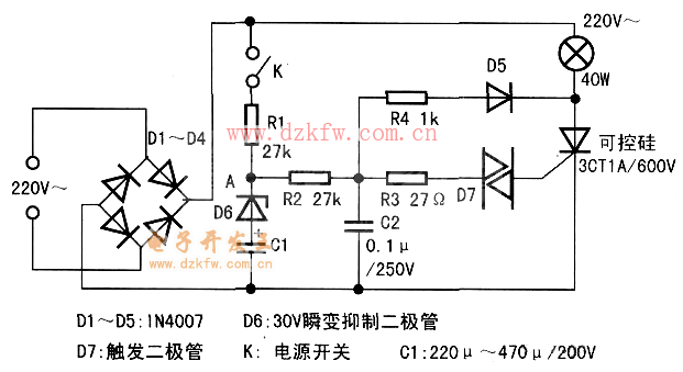 白枳燈的功率為25W~40W之間,如果功率是60W~100W,可控硅應(yīng)換成(2A~3A)/600V的。