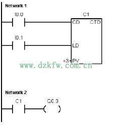 當I0.1斷開時,減計數器C1的當前值從3變到0。I0.0的上升沿使C1的當前值遞減。I0.1接通時裝載預置值3。當計數器C1的當前值=0時,C1接通。