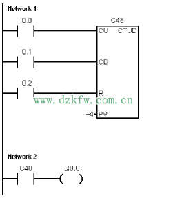 當 I0.0接通時,使用增計數,www.diks.com.cn 版權所有 計數器數值增加,當 I0.1接通時,使用減計數,計數器數值減少,當I0.2接通時, I0.2將當前值復位為0,當當前值=4時,將增/減計數器C48接通,輸出Q0.0.