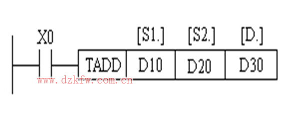 (2)時鐘數據加法運算指令TADD(FNC162) TADD(P)指令的功能是將兩個源操縱數的內容相加結果送進目標操縱數。源操縱數和目標操縱數均可取T,C和D。TADD為16位運算,占7個程序步。如圖3-87所示,將[S1.]指定的D10~D12和D20~D22中所放的時、分、秒相加,把結果送進[D.]指定的D30~D32中。當運算結果超過24小時時,進位標志位變為ON,將進行加法運算的結果減往24小時后作為結果進行保存。