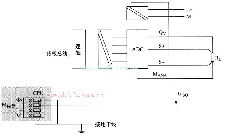 情況Ⅰ:將4線負載連接到電氣隔離模塊的電壓輸出。采用4線負載電路可獲得更高的精度。對S-和S+傳感器線路直接接線并連接到負載。這樣即可直接測量和修正負載電壓。干擾和電壓突降可能會在檢測線路S-和模擬電路MANA的參考回路同產生電位差。此電位差不得超過設定的限制值。任何超過限制值的電位差都會對模擬信號的精度產生不利影響,如圖17所示。