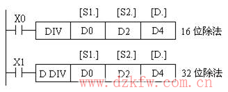 (4)除法指令DIV (D) DIV (P)指令的編號為為FNC23。其功能是將[S1.]指定為被除數,[S2.]指定為除數,將除得的結果送到[D.]指定的目標元件中,余數送到[D.]的下一個元件中。如圖4所示,當X0為ON時(D0)÷(D2)→(D4)商,(D5)余數(16位除法);當X1為ON時(D1,D0)÷(D3,D2)→(D5,D4)商,(D7,D6)余數(32位除法)。
