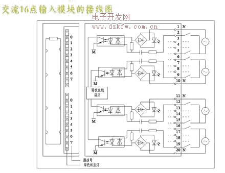 下圖為交流16點(diǎn)輸入模塊接線圖。