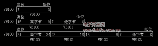 3)、無論V寄存器還是M寄存器,里面的不同數據類型(VB、VW、VD、MB、MW、MD)都是基于寄存器內存總字節地址為偏移地址。