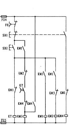 PLC沒有斷電延時型定時器,只有通電延時型定時器。本梯形圖的工作原理:當外接啟動按鈕SB2按下,驅動第一梯級X000的常開接點閉合,通過串接其后的X001、T1、T0、Y002的常閉接點,接通輸出繼電器,由于Y000線圈的閉合,促使第一梯級第一支路中的并聯常開觸點閉合形成Y000線圈自保,至使Y000驅動的接觸器KM3閉合將電動機繞組接成星形。在這同時,第二梯級中的左母線一側的常開觸點Y000閉合,通過串接其后的X001、Y003的常閉接點接通了輸出繼電器Y001和另一支路經Y002常閉接點相串的定時器線圈T0(K值為40)。由于Y001線圈的閉合使與本支路相并的母線一側Y001閉合形成了Y001線圈自保。由于Y001線圈的閉合,接于Y001后的外部接觸器KM1閉合,電動機處于星接啟動狀態。在Y001閉合的同時定時器T0也已開始計時,4S后定時器T0常閉接點,在第一梯級中切斷了輸出繼電器Y000線圈,解除了星接。而在這同時,第三梯級中左母線一側的T0 常開接點閉合,通過串接其后的X001、Y000的常閉接點,接通了輸出繼電器Y002。由于Y002的接通,并接于左母線一側的Y002閉合,使Y002線圈形成自保。Y002線圈后所接的接觸器KM2接通,完成了星角轉換,使電動機進入了角接狀態。第一梯級中與第三梯級中所串接的Y002和Y001常閉接點實質是星與角的互鎖。停止按外接停止按鈕SB1,從梯形圖中可以看出由SB1驅動的第一梯級、第二梯級和第三梯級均串接了X001的常閉觸點,其目的是讓電動機在任一運行狀態,均能可靠停止。而在第四梯級X001接的是常開觸點,其一旦閉合,通過串接其后的定時器常閉接點,接通了輸出繼電器Y003線圈和定時器T1線圈,由于Y003線圈的閉合,其并接于第一梯級第二支路中的Y003常開接點接通了Y000線圈,驅動KM3閉合,使電動機的處于星接狀態,以提供直流通道。在線圈Y003閉合后,驅動了外接接觸器KM4在電動機停止交流供電的情況下向電動機提供直流電進行能耗制動。定時器線圈T1是與線圈Y003同時獲電,并開始計時,計時時間一到,串接于第一梯級與第四梯級的常閉接點斷開,使電動機完成了停車與制動的過程。外部接觸器接線時,應考慮接觸器間的互相聯鎖以防短路。另本梯形圖沒設置熱保護。