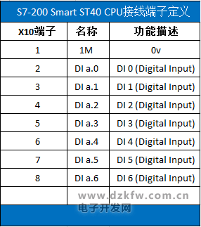 CPU ST40模塊的上部分也有一個端蓋,掀開后可以看到兩個接線端子,左邊編號X10,右邊編號為X11,這是數字量輸入和電源供電的地方。其中X11的18號端子為24V供電的正極,19號為負極,20號為功能性接地。具體的針腳定義見下面的表格: