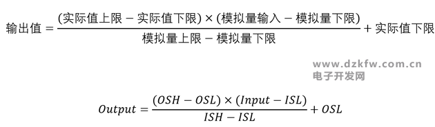 模擬量計算子程序,主要是將一個范圍的值對應到另個范圍中的值。程序代碼中應用的公式如下圖所示。