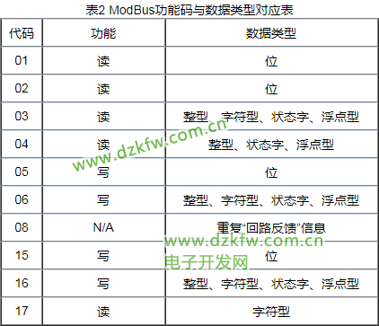 表1 ModBus功能碼列表
