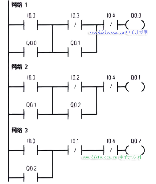 2. 單向順序停止控制電路就是要求按一定順序停止已經執行的各機構。只有 Q0.2停止后才可以停止 Q0.1,若想停止 Q0.0,則必須先停止 Q0.1。I0.4 為急停按鈕。