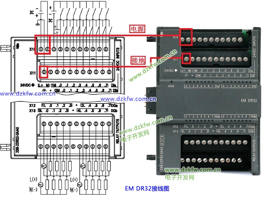 (1) 模塊缺少24V直流供電電源; I/O擴展模塊缺少24V直流供電電源時,所有通道指示燈也以紅色閃爍。建議核對模塊接線圖,尤其是模塊供電端含兩排端子的,確定供電接線是否正確,以EM DR32為例,正確的接線方式如下圖所示。