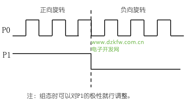 單相(2輸出):組態時如果選擇單相兩輸出,則一個輸出(P0)控制脈沖,另一個輸出(P1)控制方向。如果需要正向運行時,則P1為高電平有效,如果需要負向運行時,則P1位低電平有效。