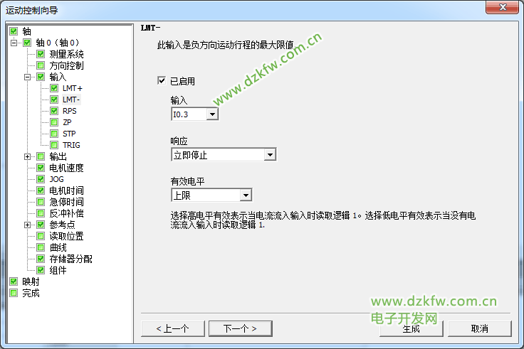 第六步:(負限位—啟用—輸入I0.3—響應—立即停止—有效電平—上限)