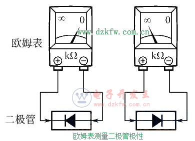如果電路有二極管,應對換兩根引線并再次檢查。將負極引線和二極管正極連接,正極引線和二極管負極連接時應導通,將兩根引線對換時應不導通(下圖)。