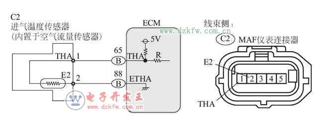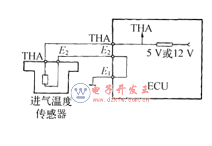 拔下傳感器插頭,接通點火開關,測量插頭上THA端子與E2端子之間的電壓應為5V。若無電壓,則應檢查ECU連接器上THA端子與E2端子間的電壓。若此電壓為5V,則為ECU與傳感器之間線路有故障;若無5V電壓,則為ECU故障。