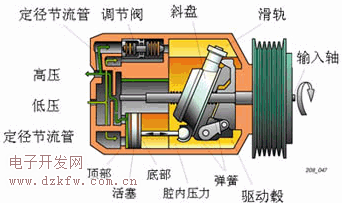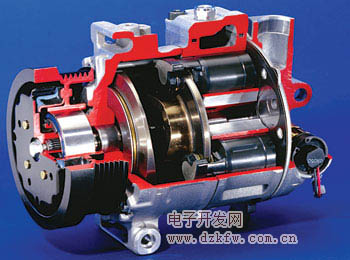 斜板式壓縮機比較容易實現小型化和輕量化,而且可以實現高轉速工作。它的結構緊湊,效率高,性能可靠,在實現了可變排量控制之后,目前廣泛應用于汽車空調。