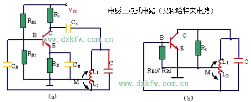 圖2 電感三點式振蕩電路 圖2 是一種電感三點式振蕩電路(又稱哈特來電路),(a)為原理電路,(b)為交流通路。