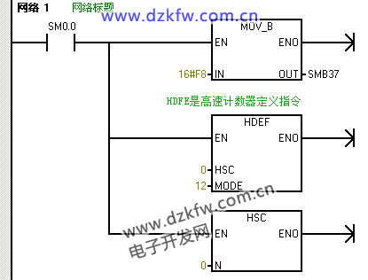 以上的程序,在主程序的網(wǎng)絡(luò)一中,首先用SM0.1首次掃描驅(qū)動(dòng)高速計(jì)數(shù)器子程序進(jìn)行高速計(jì)數(shù)初始化,同時(shí)對(duì)Q0.0的過(guò)程映像區(qū)清零。在高速計(jì)數(shù)器子程序中,首先傳送16#F8到SMB47定義控制字節(jié)定義為更新當(dāng)前值加計(jì)數(shù),然后執(zhí)行HEDF指令定義高速計(jì)數(shù)模式12和選擇高速計(jì)數(shù)器0,最后是激活高速計(jì)數(shù)器,執(zhí)行HSC指令。