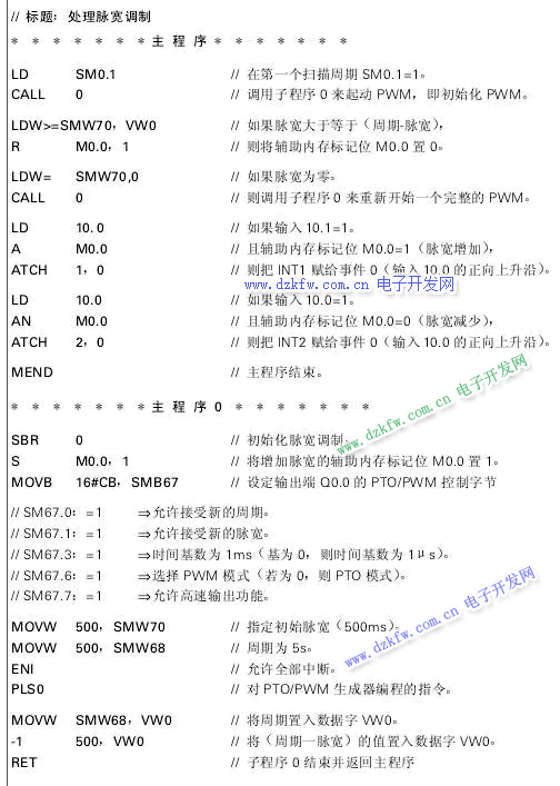 特殊存儲字節SMB67用來初始化輸出端00.0的PWM。這個控制字內含PWM允許位,修改周期和脈寬的允許位,以及時問基數選擇位等。子程序0來調整這個控制字節。通過EN}指令,使所有的中斷成為全局允許,然后通過PLSO指令,使系統接受各設定值,并初始化“PT O/PWM發生器”,從而在輸出端00.0輸出脈寬調制(PWM)信號。