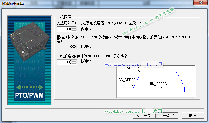 C、單擊“下一步”后,在對應的編輯框中輸入MAX_SPEED 和SS_SPEED 速度值。輸入最高電機速度“90000”,把電機啟動/停止速度設定為“600”。這時,如果單擊MIN_SPEED值對應的灰色框,可以發現,MIN_SPEED值改為600,注意:MIN_SPEED值由計算得出。用戶不能在此域中輸入其他數值。