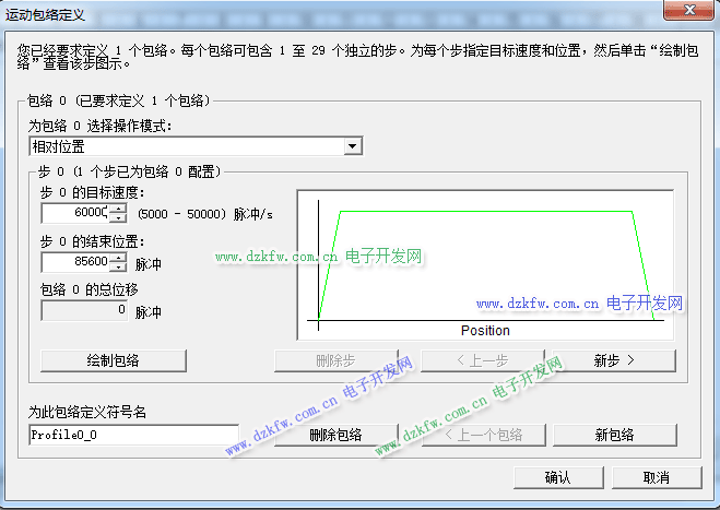 該界面要求設定操作模式、1個步的目標速度、結束位置等步的指標,以及定義這一包絡的符號名。(從第0個包絡第0步開始)。在操作模式選項中選擇相對位置控制,填寫包絡“0”中數據目標速度“60000”,結束位置“85600”,點擊“繪制包絡”,如圖9所示,注意,這個包絡只有1步。包絡的符號名按默認定義。這樣,第0個包絡的設置,即從供料站→加工站的運動包絡設置就完成了。現在可以設置下一個包絡。